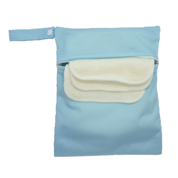 The Reusable Wipe Set contains 10 reusable bamboo wipes and a double zipper wetbag. Double zipper bags have two compartments, so you can put your clean wipes in one side and your dirty wipes in the other. Just moisten your wipes for a great reusable alternative to disposable wet wipes.